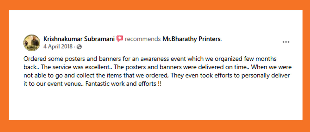 Ordered some posters and banners for an awareness event which we organized few months back.. The service was excellent.. The posters and banners were delivered on time.. When we were not able to go and collect the items that we ordered, They even took efforts to personally deliver it to our event venue.. Fantastic work and efforts !!